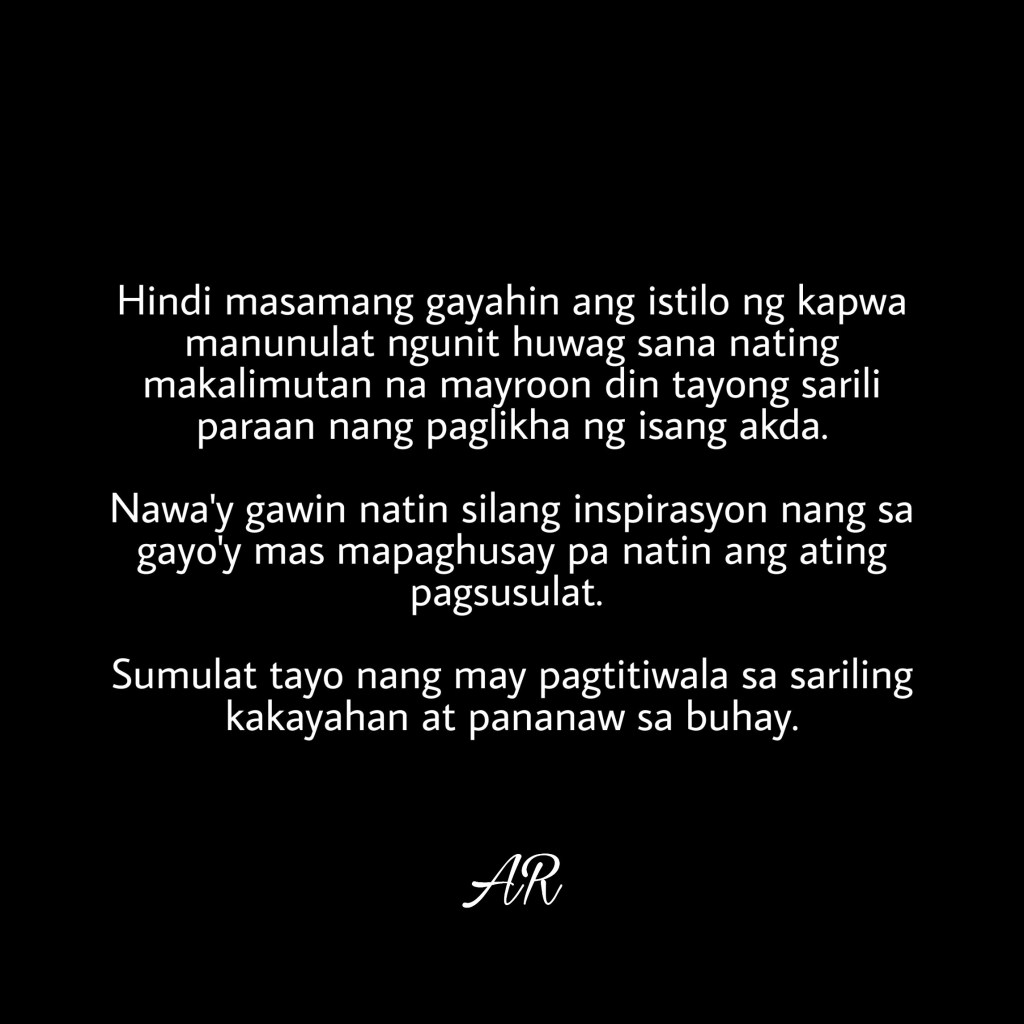 Tuklasin mo ang iyong istilo sa pagsulat. Matagal at nakakapagod man ang magiging paglalakbay upang ito’y mahanap, higit naman itong ligtas kaysa maligaw sa kagubatang nilikha ng kapwa mo manunulat.